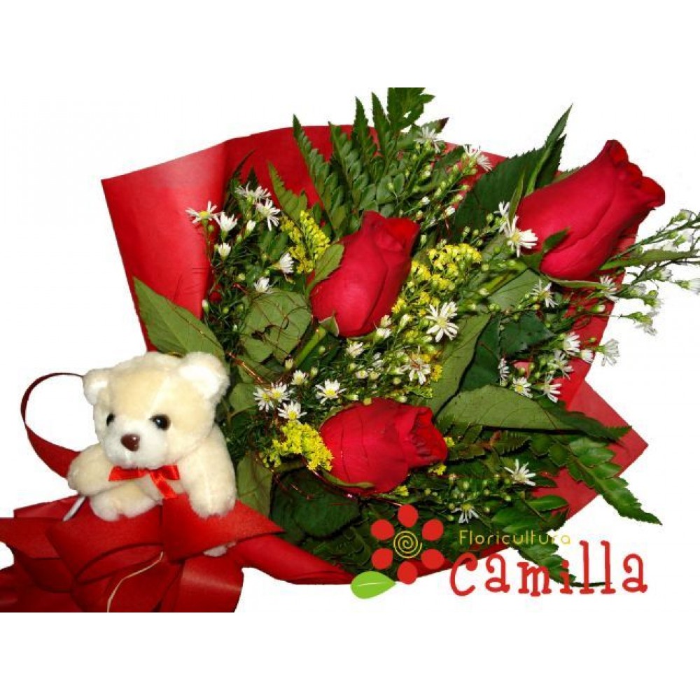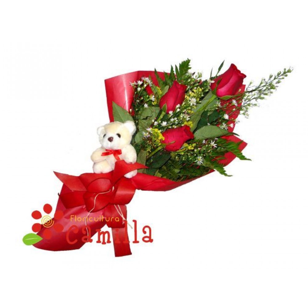 Ramalhete com 03 rosas vermelhas nacionais e complementos, acompanha urso de pelucia pequeno.