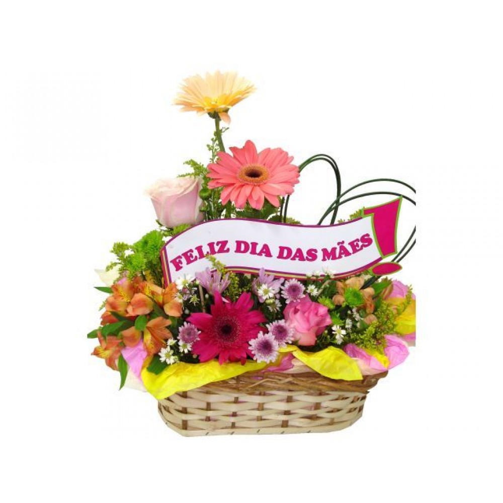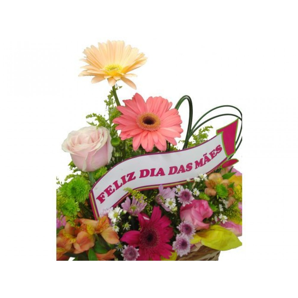 Arranjo com flores mistas coloridas, com placa decorativa.