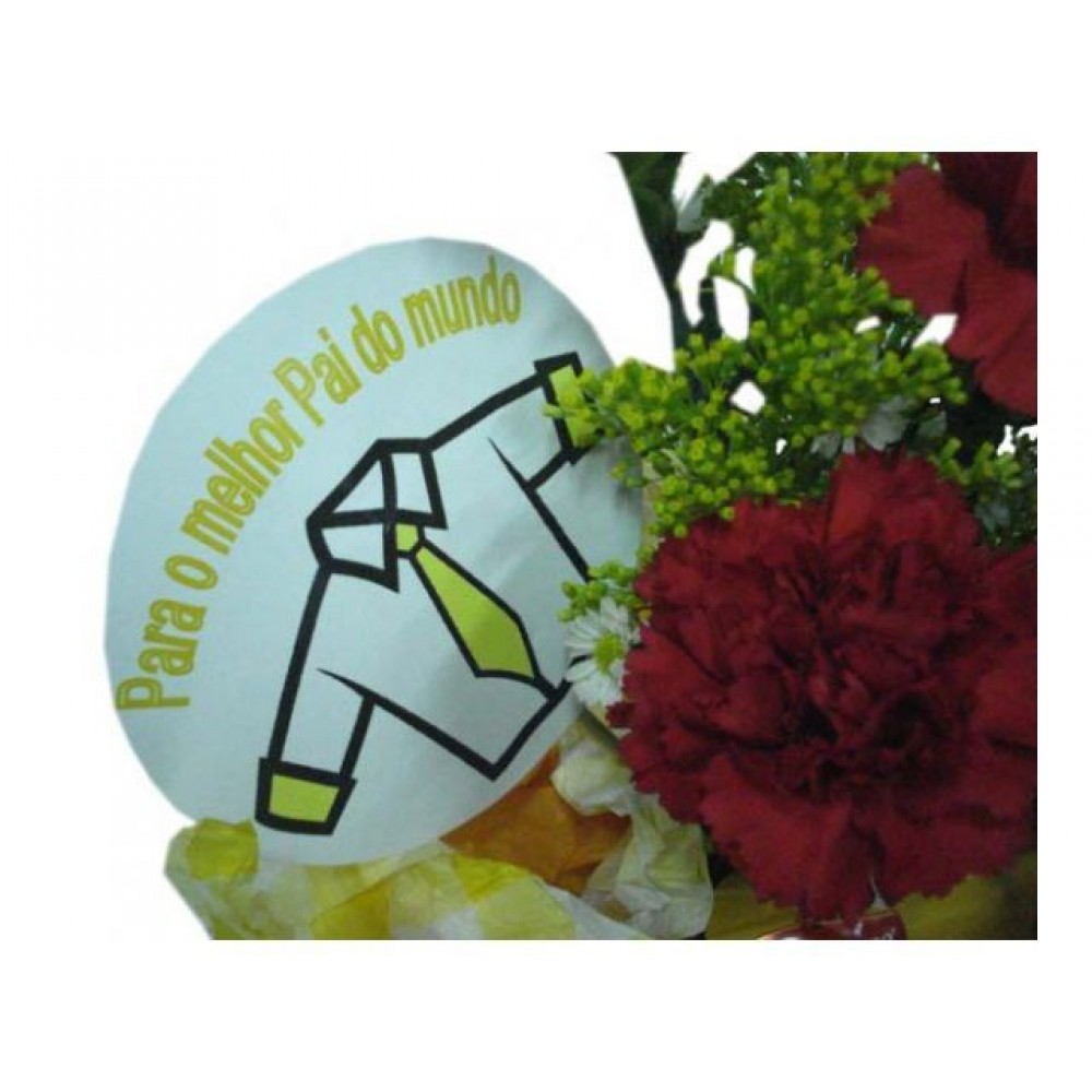 Bandeja de vime, com arranjo de cravos acompanha embalagem externa sendo celofane e laço;
