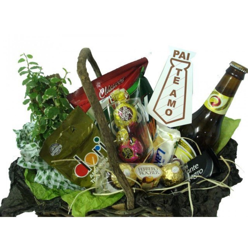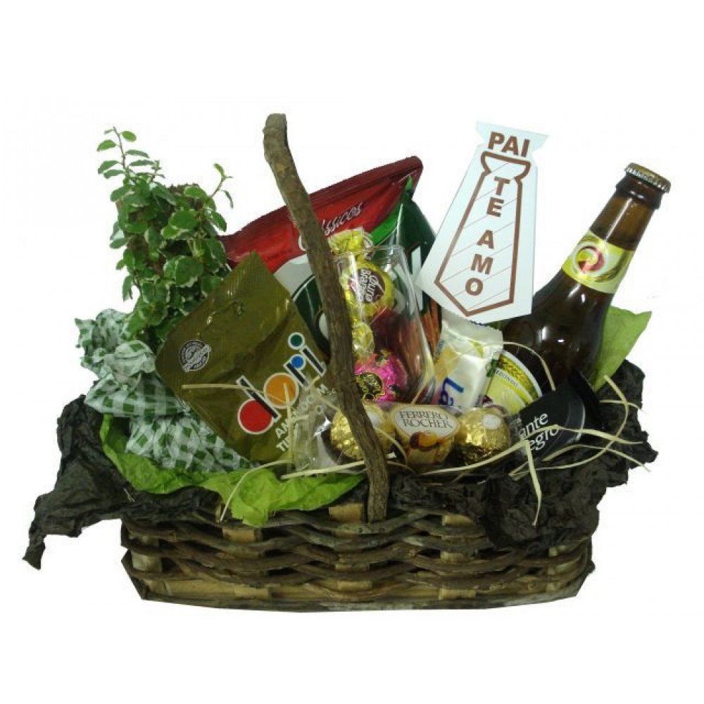 Cesta de madeira rústica, com vaso de planta e embalagem contendo: