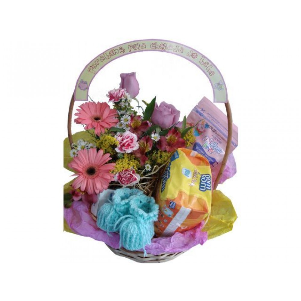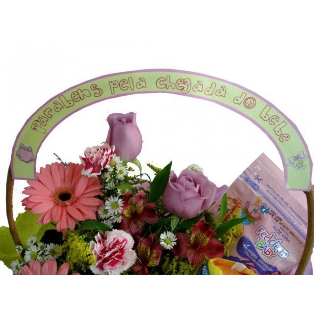 Cesta de maternidade com faixa em papel couchê escrito ''Parabéns pela chegada do Bebê''.