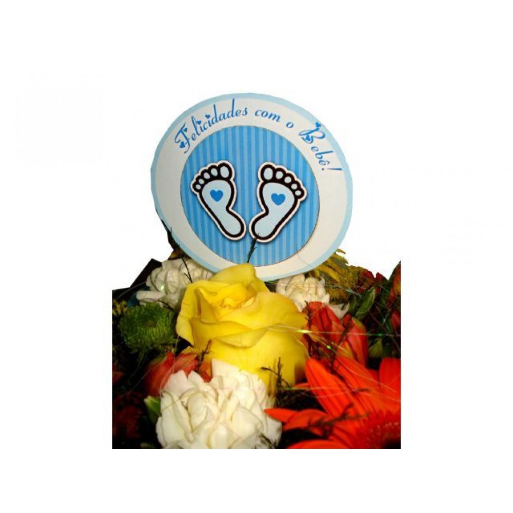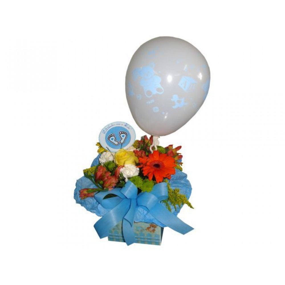 Arranjo de flores mistas, em tons claros com complementos, acompanha placa escrito '' Felicidades com o Bebê'' e 01 balão. Decoração em tons de azul.